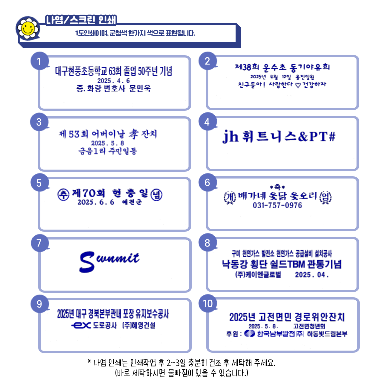 - Àμ⸦ ÇϽô °æ¿ì, ´ç»ç¿¡¼´Â °í°´´ÔÀÌ º¸³»ÁֽŠ¿ø°í ¹× µµ¾ÈÀ» ±âº»À¸·Î ÇÏ¿© Çʸ§À» Á¦ÀÛÇϰí, Á¤È®¼ºÀ» ±âÇϱâ À§ÇØ °í°´´Ô°ú ÀçÈ®ÀÎ ÈÄ ½ÇÁ¦ Àμâ ÀÛ¾÷À» ÇÕ´Ï´Ù. (ÃÖÁ¾ µðÀÚÀÎ ½Ã¾ÈÀÇ À߸øµÈ È®ÀÎÀº Ã¥ÀÓÀÌ ¼ö¹ÝµÇ¹Ç·Î Á¤È®ÇÏ°Ô È®ÀÎÇÏ¿© Áֽñ⠹ٶø´Ï´Ù.)